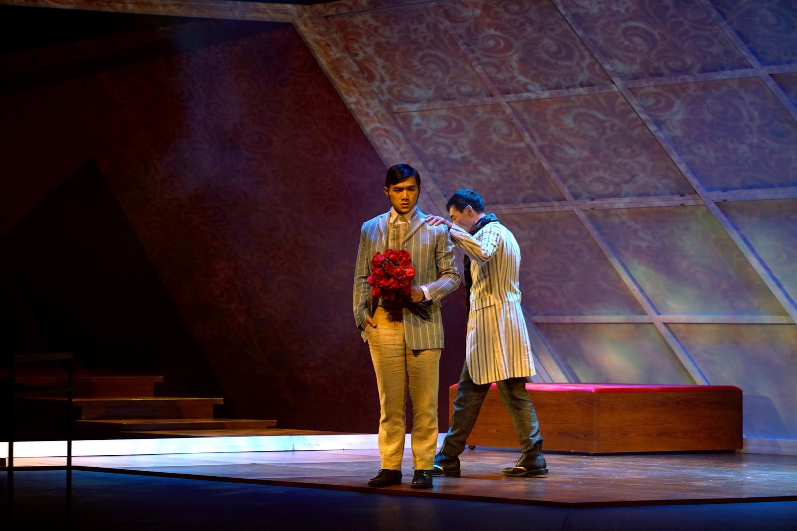 《禁式極樂園》的影像效果由多媒體設計師楊振業李天倫聯合創作,舞台背景像極一本打開了的書,白色書頁和門框設計感強烈,與暖色沙發、純白木馬都在數碼投影中染上碎花牆紙圖案。「爸爸」和栗子先生的英式紳士服裝,瞳瞳的日系lolita造型,詭異地營造出飽含溫馨氣氛的「一樹梨花壓海棠」人物關係。那邊廂的密室問訊,則是空間兩端只有桌椅的對抗性設置,女探員和賈杜分別身穿灰色太空棉制服和囚衣,從而帶出未來世界的超現實感。其中最有趣的是賈先生,盤問中一名平凡的中年男子,在「密園」馬上搖身一變為風度翩翩的貴公子,連靴子也有一抺金色。《禁式極樂園》恰恰是在一系列的色彩和(投影、佈景、服裝)設計對比中,築構出現實的無味和虛擬的夢幻。